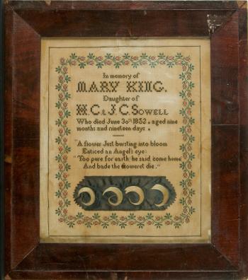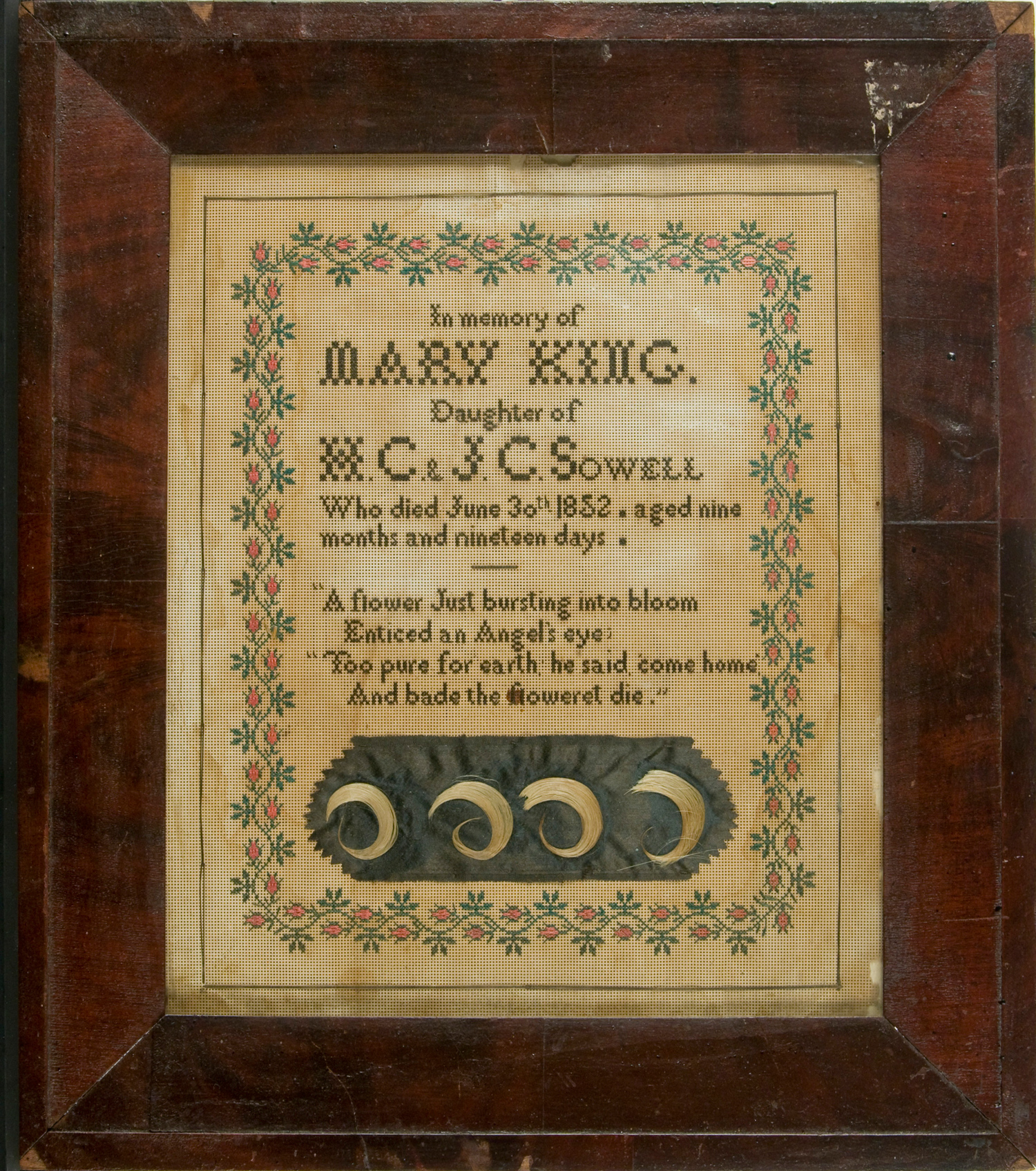 This sampler was probably stitched by Jane Cleopatra King Sowell (1828—1919), mother of Mary King Sowell, or by another close female relative of the little girl. The maker attached four blonde curls to a black ribbon and stitched the ribbon to the bottom of the sampler. The original frame, constructed of remnants of veneer, is attributed to a family member who was a furniture maker.